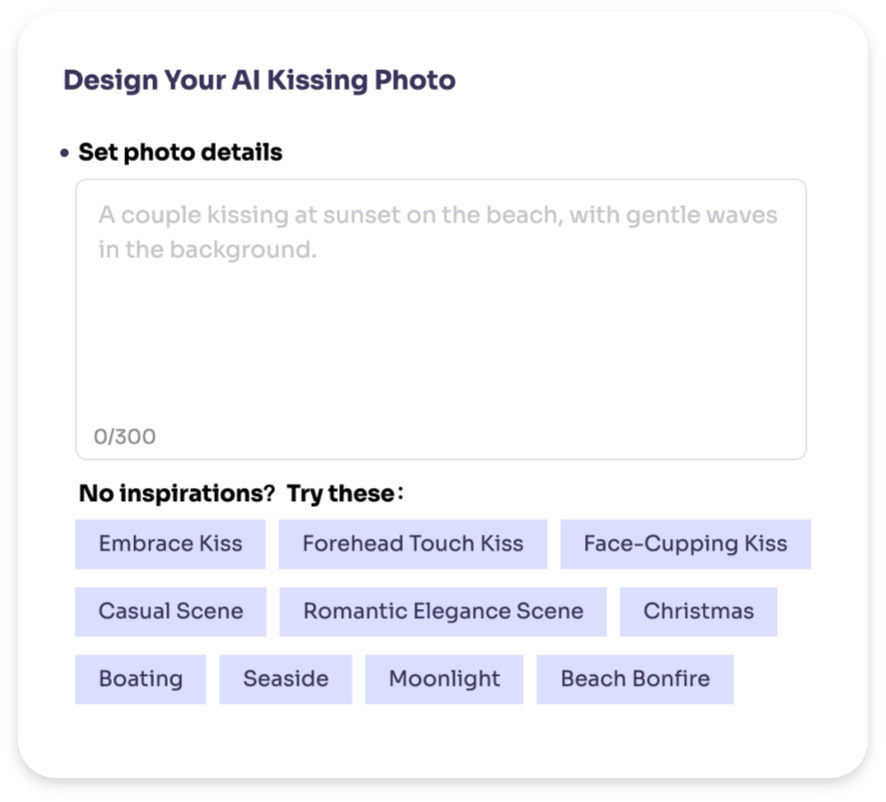 To start, describe your desired kissing photo in a few sentences. Keep in mind that the more detailed you describe, the more satisfied photos you will get.